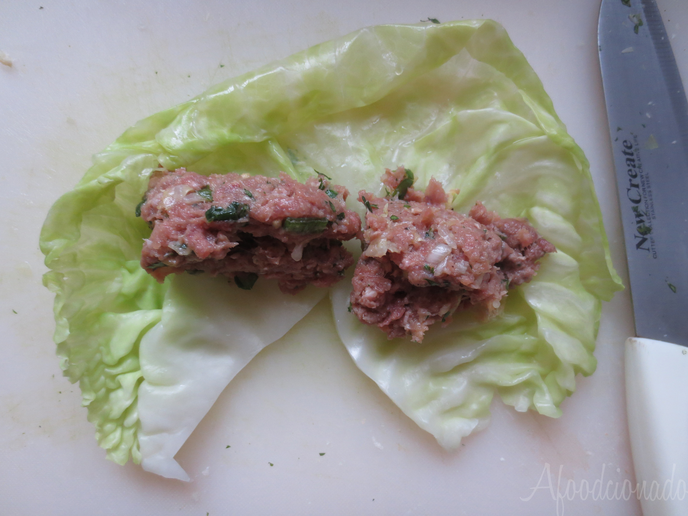 - Now to wrap! Take a cabbage leaf, cut the hard spine at the bottom in a V shape. Spoon the meat mix (about 2 tbsp) into each leaf depending on how big it is, and wrap! The curled edges of the leaf will help you tuck everything in.