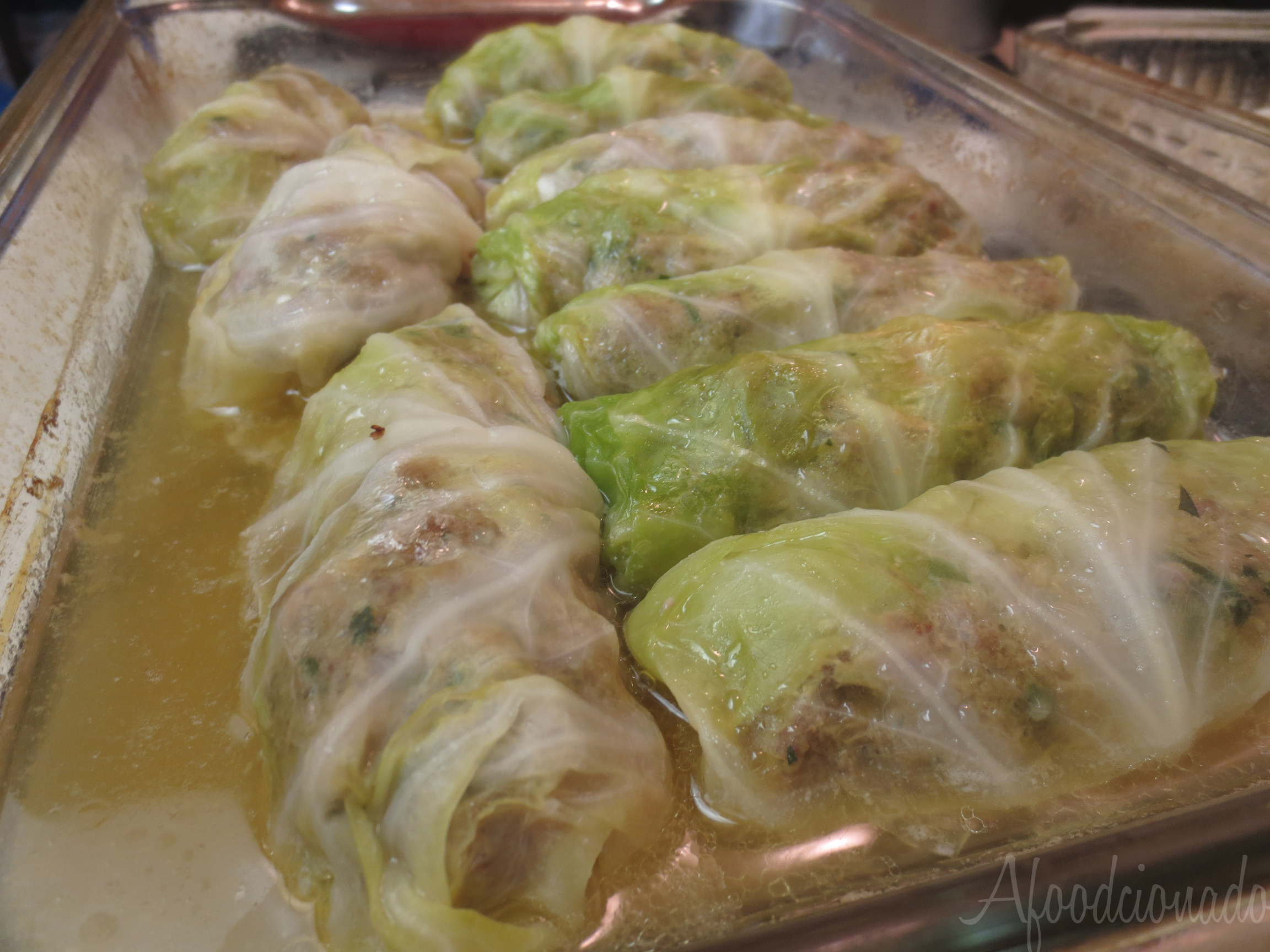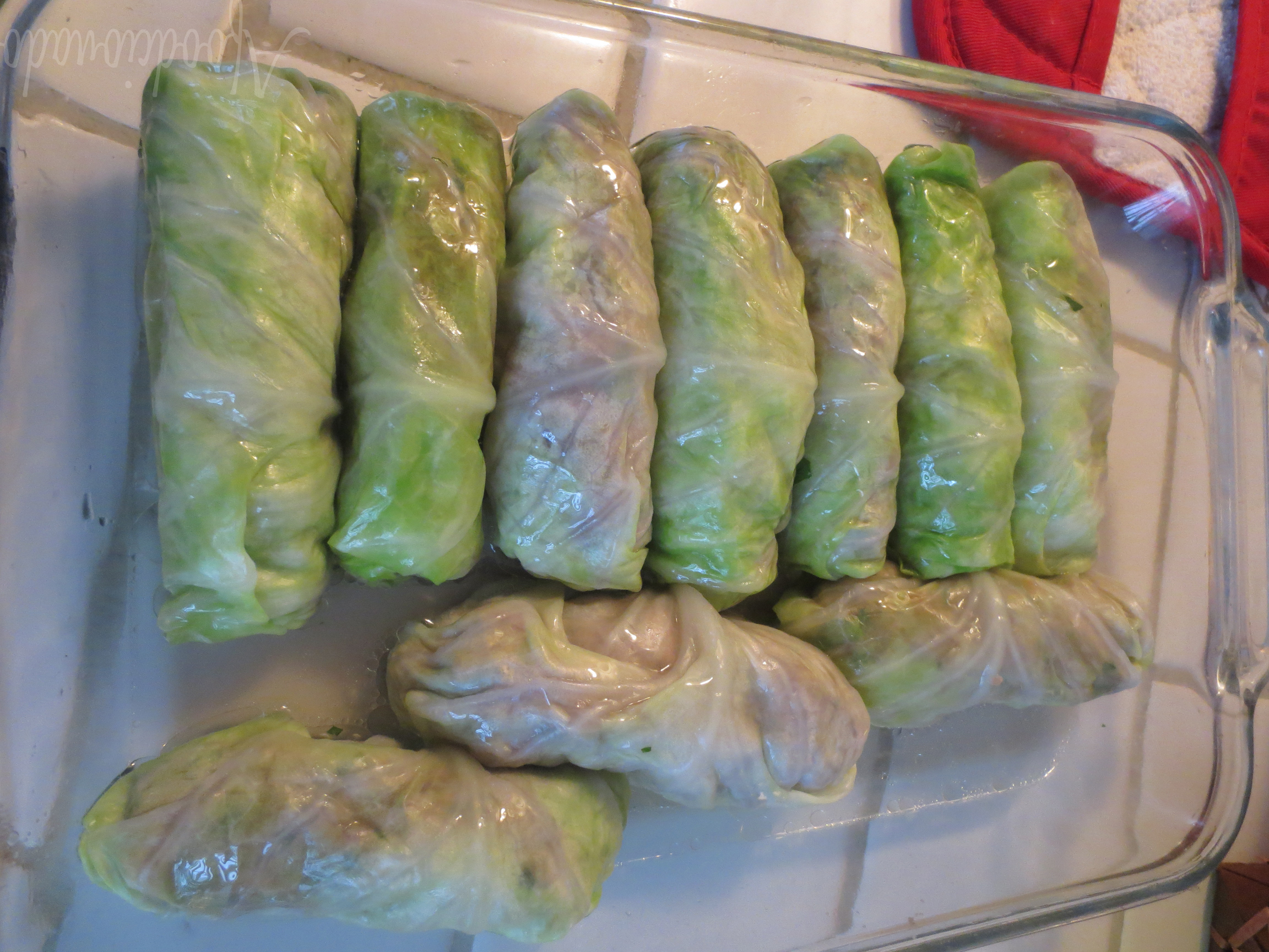- You can tell when the leaves are ready when you take a pair of tongs (preferably ones with silicone claws…probably not the right word) and wiggle the outside leaves off the cabbage. When you manage to wiggle the outer cooked leaves off the head of cabbage, place the leaves on a plate and cover the pot so the other leaves can continue to cook. Repeat until you you have a ball of cabbage slightly smaller than a tennis ball.