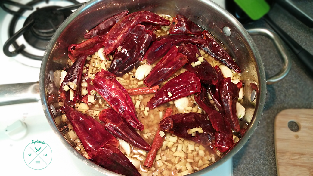 - I was too lazy to find dried guajillo chilies so I used the dried red chilies from the HUGE bag we bought from the Korean market. (Cleaned, stemmed, and seeded)