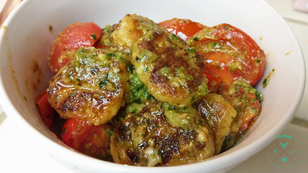 So lazy that I didn’t even filter the photo…so #NoFilter works here. I haven’t had a chance to really cook not to mention post. I tried to instagram some photos though (Follow @Afoodcionado)! Anyway, this super quick dish would have been perfect for the busy few weeks I’ve had. Remember the gnocchi we made before….HERE? This is where the batch of frozen gnocchi come to play! Since this is a lazy recipe, the pesto isn’t homemade, rather it’s the deliciously cheesy one from Costco, and I threw some tomatoes in there to have some vegetables. Doesn’t blistered tomatoes sound fancy? I think so…but they aren’t. Here is how I put it all together!…you’ll notice the…eye ballin’ measurements